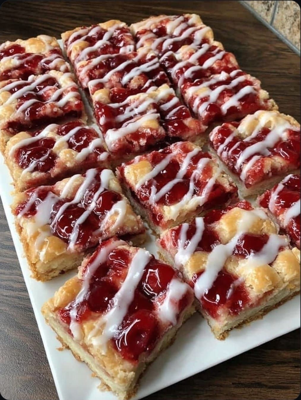 Spread Cherry Filling: Spread the cherry spread evenly over the dough in the pan.