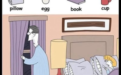 Can you spot the book, egg, cup, and pillow?